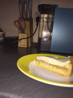 5. Die Quarkmasse über den Rhabarber geben, sie ist so flüssig, dass ihr sie nicht verteilen müsst, die fließt von selbst dorthin, wo sie gebraucht wird.