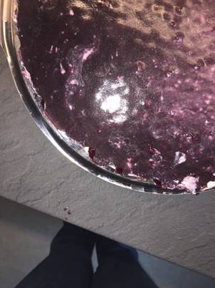 9. Die Gelatine mit etwas Fruchtsaft anrühren und dann im übrigen Fruchtsaft erhitzen, bis sie sich aufgelöst hat, dann die Heidelbeeren dazugeben, etwas abkühlen lassen und mit einem Esslöffel auf der Torte verteilen
