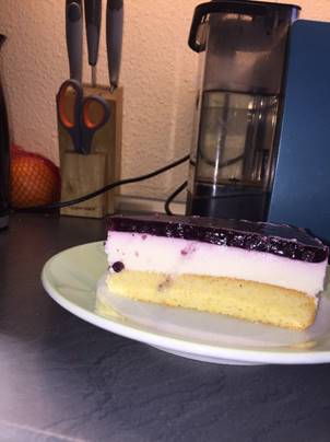 Sicherlich fragt ihr euch, wieso die Heidelbeeren nicht gleich in den Joghurt gerührt werden (könnt ihr auch machen, Rezept dazu unter Himbeerjoghurt-Sahnetorte). Das ist mehr oder weniger eine optische Sache. Die Sehenden finden den Anblick dieser Torte echt schön mit dieser seperaten Fruchtschicht obenauf. Und wir haben halt den Geschmack von Vanillinjoghurt, der dann in Heidelbeere übergeht.