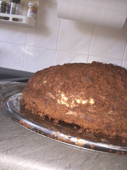 Wenn die Sahne ein bisschen fest geworden ist, richtet ihr eine kegelförmige Kupppel daraus auf den Birnen an. Danach bekrümelt ihr diese Sahnekuppel mit den Kuchenbröseln und drückt diese ordentlich fest. Die Kuppeltorte muss jetzt in den Kühlschrank.