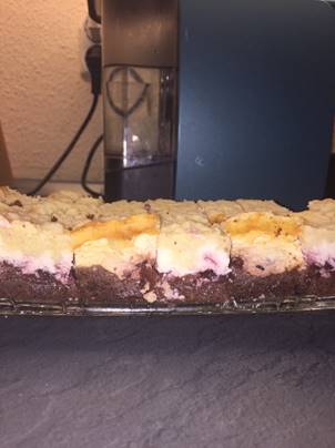 1. Aus den Zutaten für den Boden einen Knetteig bereiten und in eine rechteckige Springform geben, keinen Rand hochziehen