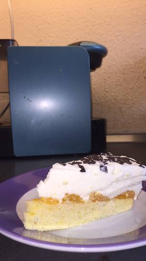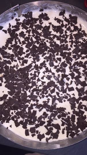 11. Den Kuchen 2 Stunden in den Kühlschrank stellen, dann die Raspelschokolade darüberstreuen und noch ein wenig kühl stellen, ich mache das insgesamt ca. 5 Stunden.