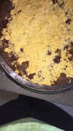 5. Aus den Zutaten für die Streusel kleine Streusel formen, immer so zwischen den Fingern vermengen, als wenn ihr die Zutaten verreibt, dann über die Kirschen streuen, immer nach System, von hinten nach vorne, bis überall welche sind